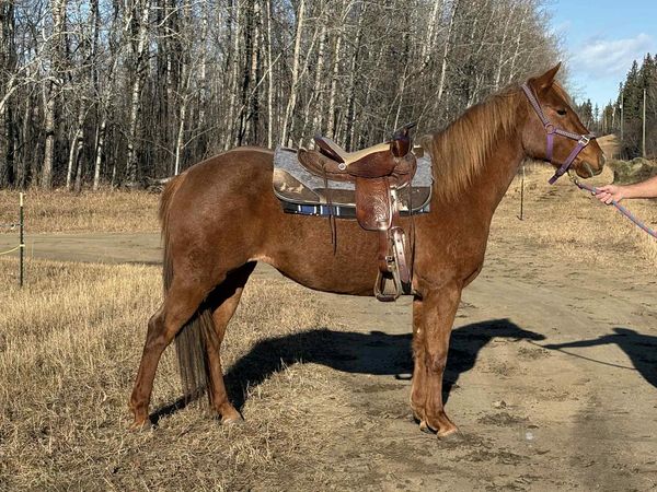This sweet filly is around 13hh, solid and lots of fun to have around. She's got a great personality, is super smart and very willing to learn.