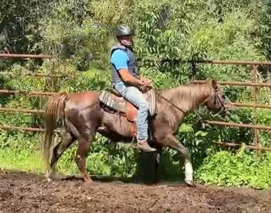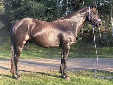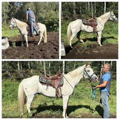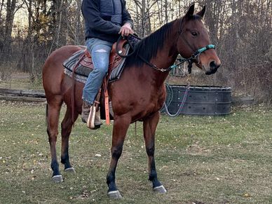 Cooper is a big sweetheart. Easy to catch, first to greet you at the gate. Solid boy with a great personality, we figure he's around 11. He's great with saddling etc but didn't want anything to do with a bit. We put a bitless bridle on him and he was great! We've been putting rides on him and hes a safe, well behaved boy. He's had a vet appt and everything went perfect! He's best suited for an intermediate rider as he has a good size engine still and looks to move out.