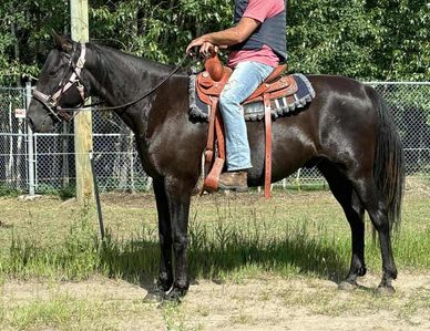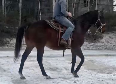 Cooper is a big sweetheart. Easy to catch, first to greet you at the gate. Solid boy with a great personality, we figure he's around 11. He's great with saddling etc but didn't want anything to do with a bit. We put a bitless bridle on him and he was great! We've been putting rides on him and hes a safe, well behaved boy. He's had a vet appt and everything went perfect! He's best suited for an intermediate rider as he has a good size engine still and likes to move out. Every once in awhile however, hell step a few steps tenderly. Hes good 95% of the time but every so often hell favor the one foot for a few strides. The vet didn't notice anything during his exam, (because of course why would he do it while being checked over), but it is there. Would we still take him on the trails? Absolutely! Barrel racing or heavy mountain climbing,? Probably not. For easy going regular rides we do feel he'd be a great partner! (It may be as simple as needing front shoes)